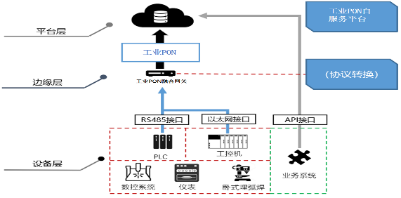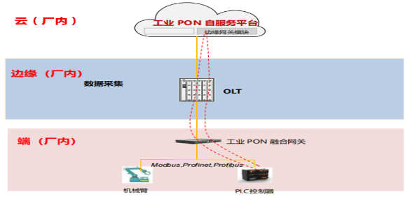 工業云端應用工業PON自服務平臺(包含邊緣網關模塊)OLTODN工業PON融合網關OLT設備具備邊緣計算特性網絡切片融合承載兼容工業接口開放式架構 端 云邊各類工業設備