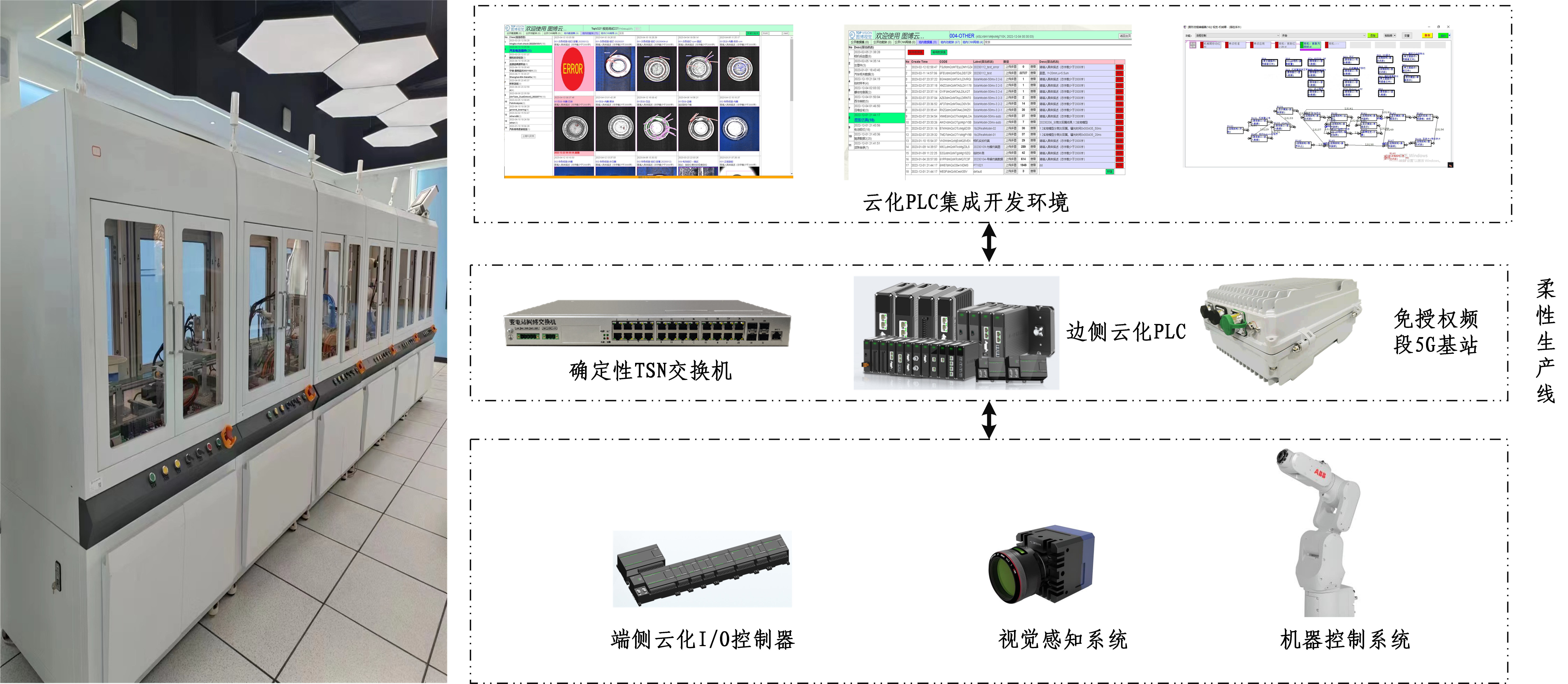 本項目將研制一套基于云化PLC的柔性生產線測試床(下簡寫為測試床)。測試床包含若干個柔性生產過程,部分柔性生產過程包含視覺感知系統和機器控制系統。測試床使用端側云化I/O控制器進行控制,通過確定性網絡與云端服務器通信,云端服務器運行PLC集成開發環境,實現IEC61131-3編程、AI編程,遠程編輯、協同開發、云端編譯、在線調試,模塊化控制、智能編排等功能。測試床內部情況如圖4所示。