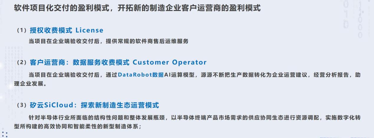 基于半導體封測行業服務的特點,根據我們現有的客戶群體及技術能力,益普提出“數據驅動決策Data Driving Decision”的口號,從軟件廠商到數字化廠商,除了軟件授權的收費方式外,真正挖掘軟件產生的數據價值,切實為企業降本增效,通過提供數據服務數據機器人DataRobot的方式,源源不斷給企業提供運營建議及經營分析報告,助力企業持續發展。通過數據服務的收費模式,產生持續的收入來源。做客戶運營商Customer Operator。