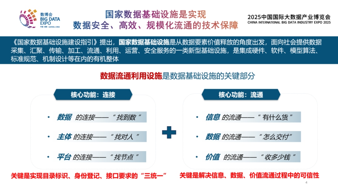 《國家數據基礎設施建設指引》提出了國家數據基礎設施的定義。數據流通利用設施是其中非常重要的一部分,而且從全球來看都是非常有探索性的。建設數據流通利用設施有兩個方面要重點考慮。一是連接,基本功能是要找到數,找到主體,找到相關的技術平臺,在這里會涉及標識目錄、身份接口統一的問題;二是流通,在連接的基礎上,完成流通,包含流通中的信息、數據的內容、數據怎么交付、涉及的價值傳遞等,所以在這里面各個層面安全可信可控的問題。