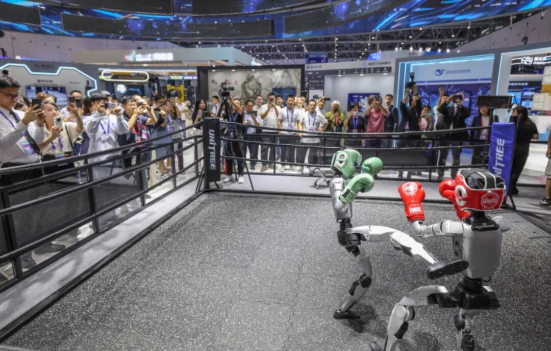 在第四屆全球數(shù)字貿(mào)易博覽會(huì)數(shù)智未來主題展區(qū)的杭州六小龍專區(qū),宇樹科技的人形機(jī)器人在進(jìn)行格斗擂臺(tái)賽。新華社記者 徐昱攝