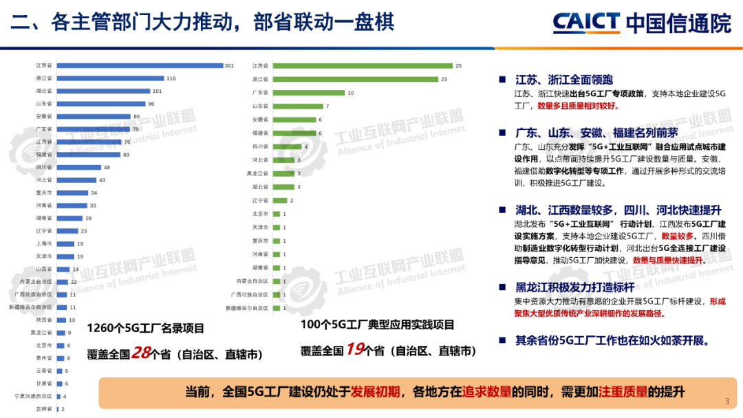 報告分析,1260個5G工廠名錄項目已覆蓋全國28個省(自治區、直轄市)、9個國民經濟門類、60個國民經濟大類。同時5G工廠作為推進工業和信息化深度融合的重要舉措,原材料工業、裝備工業、消費品工業、電子信息、能源交通等行業企業與基礎電信企業、設備及行業服務商深度合作,形成100個5G工廠典型應用實踐,各工廠平均5G網絡覆蓋率高達99.3%、現場裝備聯網率高達97.7%、無線設備5G聯網率達97%,“5G+工業互聯網”應用場景建設數量達10.5個,5G在工廠內由“單點”應用向全環節、全流程、全周期、全局、自主協同等“綜合”應用發展。一是加速企業全環節柔性生產。5G工廠推動工廠網絡無線化,通過5G全廠覆蓋,探索實現生產現場裝備云化群體控制、產線模塊化快速重構、供應鏈實時動態協同等,從而支撐企業依據市場需求,實現全環節快速調整的柔性生產方式。二是5G+數字孿生實現生產全流程精益管控。通過5G工廠系統性實施, “5G+數字孿生”已從產品研發設計、企業生產運營的可視化應用,擴展到安全生產閉環管控、廠區物流實時優化、關鍵部件精準運維等應用,實現了“虛實映射、實時監控”的工廠生產全流程精益管理。三是5G+大數據賦能企業全生命周期能碳精準管理。企業通過5G工廠建設,充分利用5G實現全廠區、全流程能源消耗與關鍵排放源數據的實時采集,構建包含碳排放監測、碳足跡核算、全鏈條碳管理等功能的能效管理體系,形成基于數據驅動的能碳精準管控模式。四是5G+AI助力實現生產全局智能發展。在5G工廠智能化服務應用要求的牽引下,工廠充分利用5G實時采集匯聚全廠及供應商相關數據,推動人工智能應用從單點輔助工具,深入到產品研發、產線生產、系統運維、企業管理等全局,形成生產供應鏈智能全局調度,產品運維智能服務等新模式。五是5G+AI融合形成多機自主協同操控。隨著5G工廠建設質量的不斷提升,5G高可靠、低時延性能不斷增強,人工智能技術的應用開發,設備遠程操控將從早期依賴人工判斷和操作的單點遠程操控,向由數據驅動的多設備自感知、自適應、自決策的智能化無人自主協同操控演進。